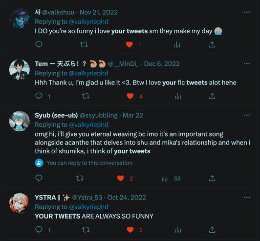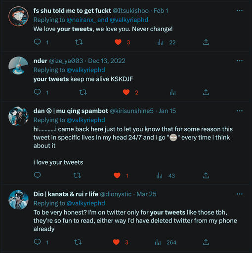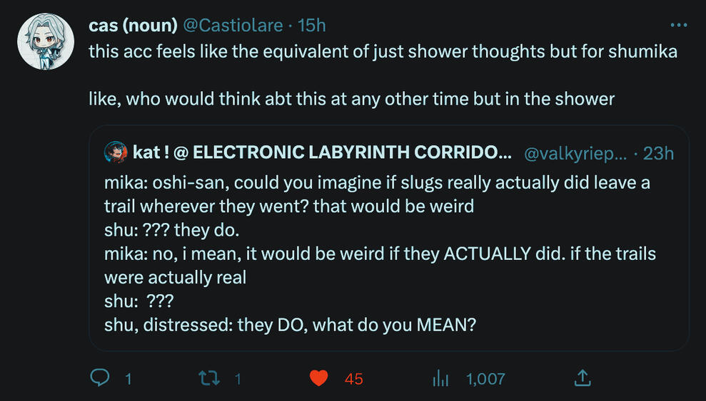 [ 1.1 ] : INTRODUCTION. kat. she/her. 26. valkyrieP. a twitter dedicated to ensemble stars, but mainly i just tweet about shumika almost all the time. i like to make lots of text posts, and they're all mainly about shumika.[ 1.2 ] : READ THIS ! english major. please tell me if you make art of my tweets or my fics, i love to be fed and i really wanna know so i can love on it !!! please also tell me if you want to see something written out in a fic. i am always one for taking suggestions and giving credit to those who inspire me !!![ 1.3 ] : FAVOURITES. MIKA is my favourite idol because i relate to him physically & mentally. he is quite literally the closest representation of a character to myself that i have ever encountered. i find myself very attached to him, and i adore him dearly. SHU is my second favourite because his gnc expression is what sustains my life. SHUMIKA is my favourite ship because i want that kind of romantic dynamic.